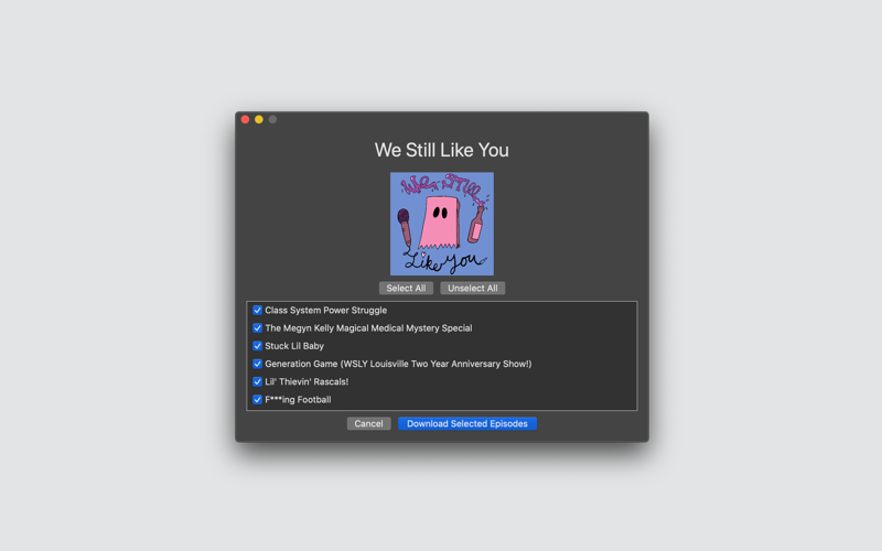 Set up favorite feeds and destination folders. This makes it easy to download new episodes of multiple podcast shows at once.