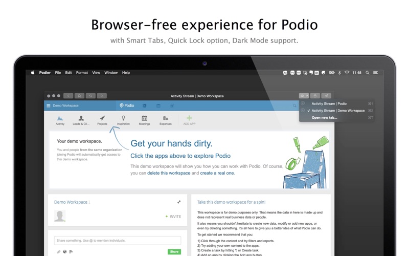 Podler is a gorgeous app that integrates with Podio. Designed to be the perfect client for Podio with Smart Tabs, Screen Lock option, Dark Mode support.