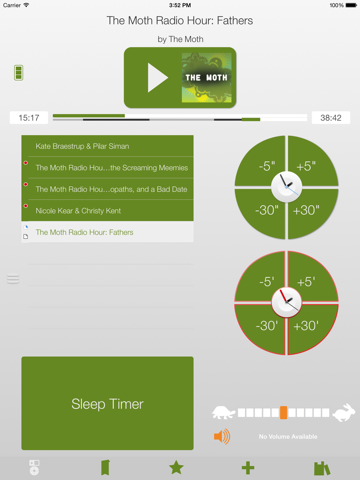 - Sleep Timer - any number of minutes, stop at end of episode, shake to add time