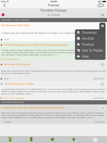 - Manage audio files - download at any time, delete audio file without deleting episode info/bookmarks