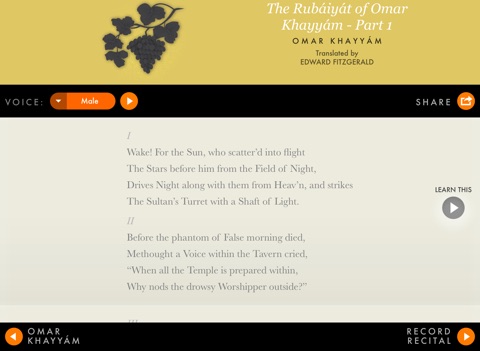 Amazing app. The only issue I had is the lack of variety in poets. Where are more recent visionaries like Angelou? Users should be able to request poems they would like to see brought to life again by the app.