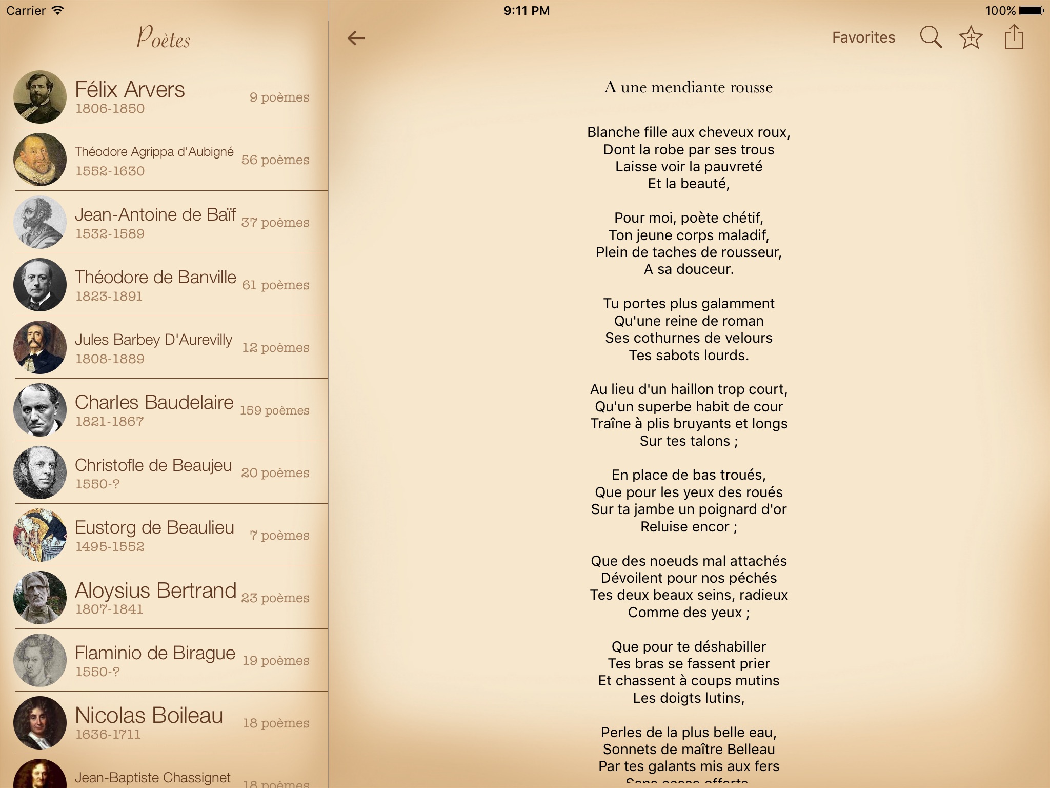 - Vous pouvez ajouter des poèmes ou des poètes à la liste de favoris
