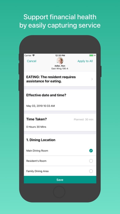 • Streamlined documentation: Allows end users to document tasks at the point of care and capture the time required to complete the task. Vitals and medication distribution to residents can be easily recorded to ensure the highest possible level of care.