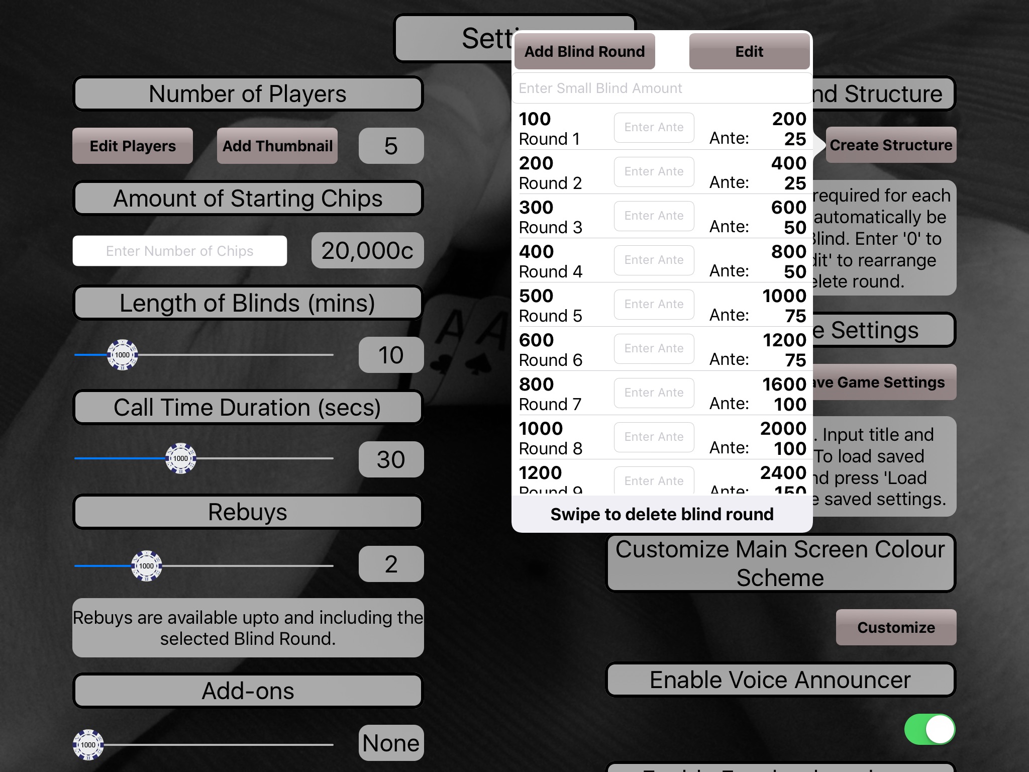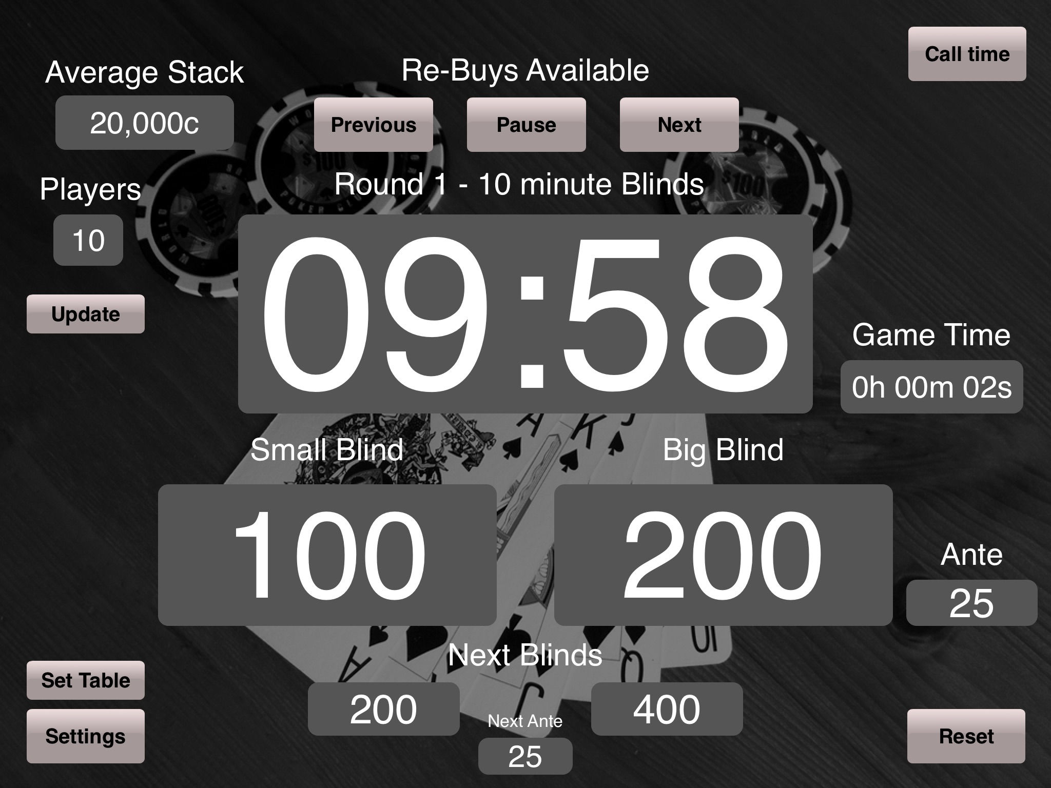 Poker Blinds Timer is a Poker game timer. Although at its core it is built around Texas Holdem, it can be used for most types of Poker game.