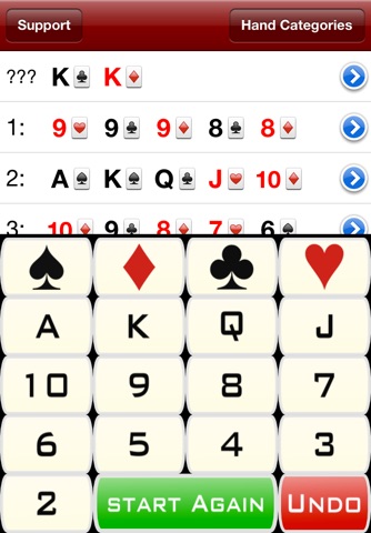 Hand Categories: This takes tou to another page where there is a list of the various types of hands that are possible. They are ranked from best to worst. You can select the disclosure icon and see another page of information about that type of hand.