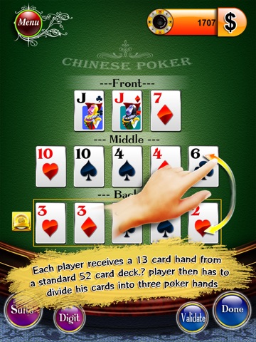 In the game, each player receives 13 cards hand from a standard 52-card deck. Each player then has to divide his cards into three poker hands (known as "setting"): two containing five cards each (known as "the middle" and "the back"), and one containing three cards ("the front"); the back must be the highest ranking hand, and the front, the lowest ranking hand