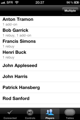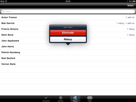 Poker Manager Remote lets you connect as an Administrator and control the tournament running under Poker Manager on your Mac or iPad. Works through WiFi or Bluetooth. Rebuy, Add-On or Eliminate any player. Resume/Pause the tournament and navigate through its rounds, launch the timer. Its just as easy to use as the Remote app for iTunes you know and love.
