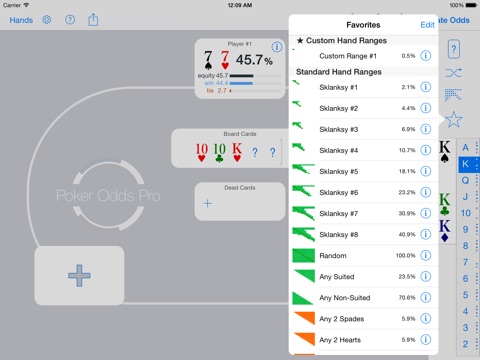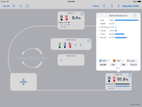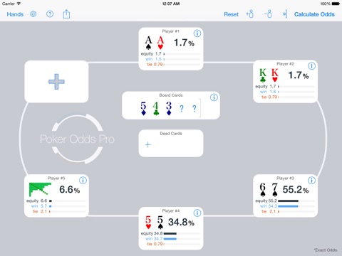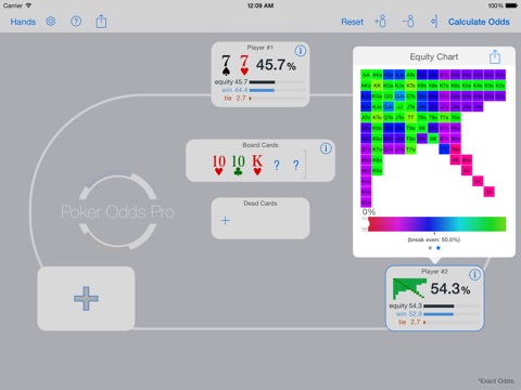 All you can ask for when its about calculating your odds. Design, usabiliy and graphic output: Best in the App-Store! Just one suggestion: An option to turn on instant odds-calculation with every change of cards.