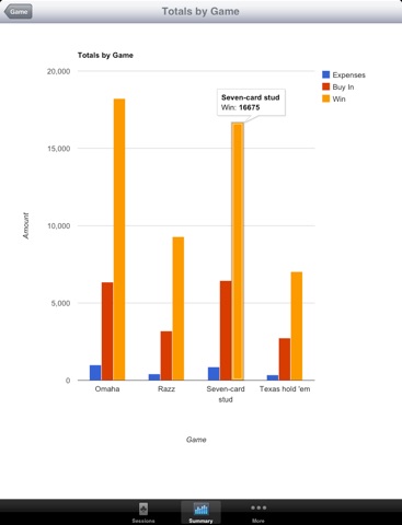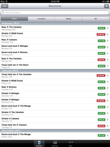 Keep track of your poker sessions and know how much you are winning! See at a glance which games and locations you are doing better at. Easily search previous sessions by game, location, or notes. Colorful charts quickly show you your data summarized in a number of different ways.