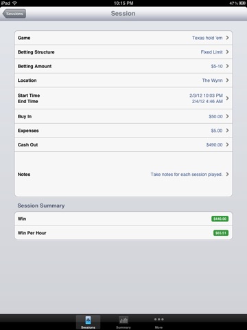 Track key session details including game, location, betting limits, start/end time, buy in, expenses, cash out, and notes.