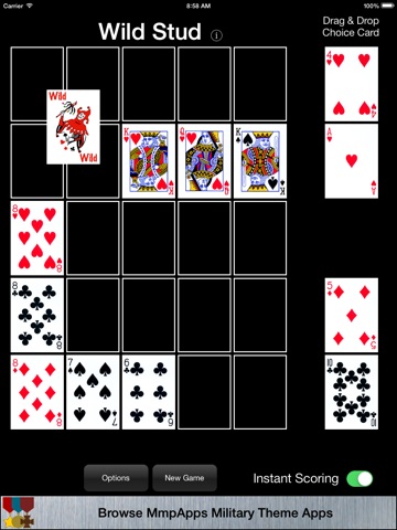 POKER CONFLICT: A competitive variant of Poker Square where you take turns with an opponent placing cards on the board. You score the rows (horizontal) and your opponent scores the columns (vertical). You can play the computer or a friend using Pass-and-Play.