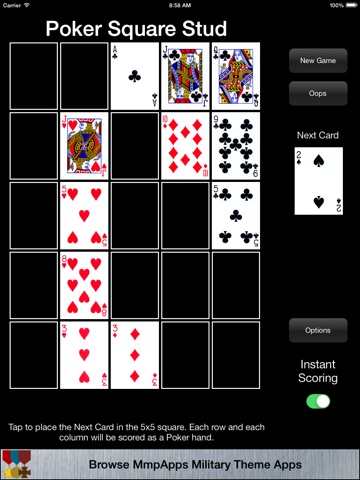 POKER SQUARE: The classic poker solitaire game where you place cards in a 5x5 grid and each row and each column is scored as a separate poker hand. Poker Square can be played in four variants - Stud, Draw, Texas, and (iPad only) Omaha.