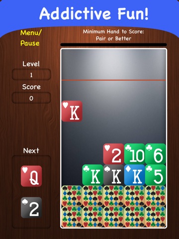Strategize and position falling cards to create the best 5-card poker hand you can in each row. Make a valid poker hand and the row clears. Otherwise, the row is stuck face-down leaving less space to maneuver.