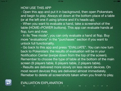 The calculation of these probabilities on the flop is a feature included in the basic version (free). To unlock the calculation on turn and river, you can buy more “evaluations” in the “purchases” section.