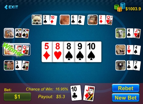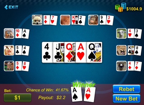The payout to the player corresponds to the probability of winning or tying that hand. For example with a “2”selection there would be a very high payout. With an “Ace, Ace” selection the payout would be lower.