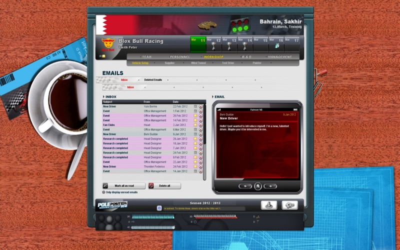 Pole Position 2012 offers you more features than ever in a Formula 1 racing team management simulation. The whole technology tree was revised from the ground up and you have to pick your own research from over 100 new technology projects. The team management system is easier to use and is even more interesting.