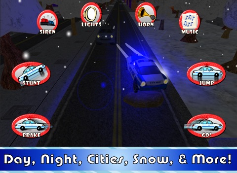 I loved playing with toy police cars as a small child, so I worked with my children to make a simple, easy to play with toy police car app. It has light up flashers, sirens, headlights, and a honking horn, plus a race and chase mode to go after those bad guys. Select you favorite car from several skins and race through city, desert, snow, and even night times!