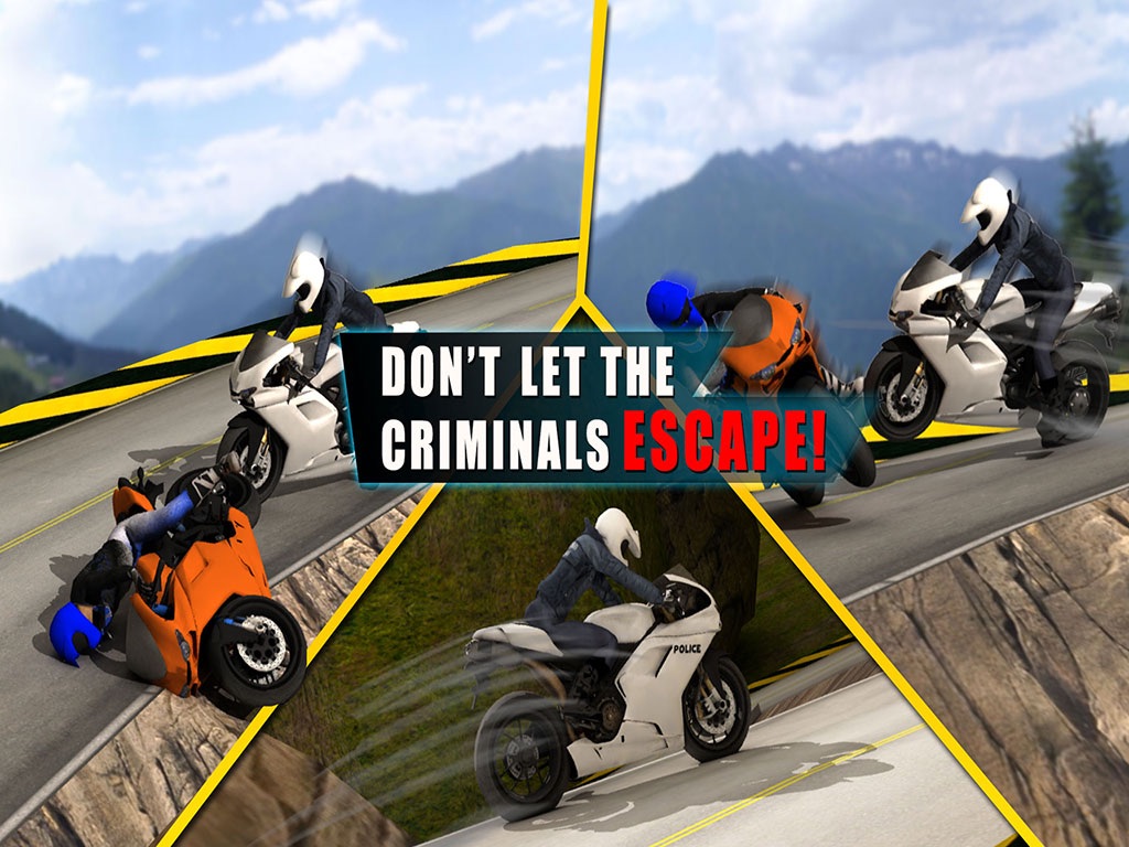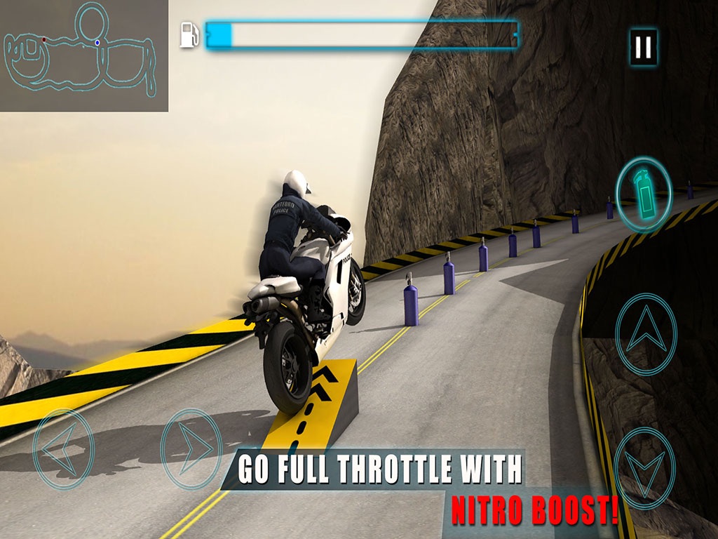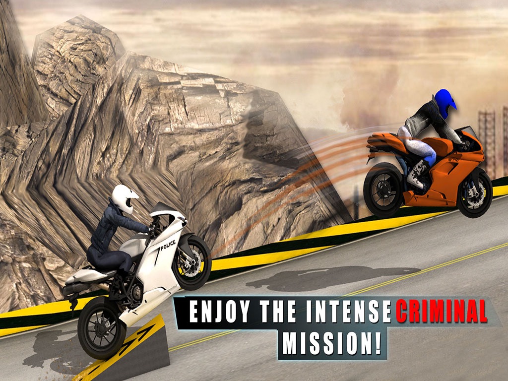 Crime rate is on the rise and gangsters roam freely. As the motorbike cop you need to catch these bad guys and bring peace to the city. Criminals are trying to escape the crime scene and thats where you come in. Hop on your bike and start chasing these thugs. They will race you to get away but go full throttle with the super charged nitro boost and dont let them escape.