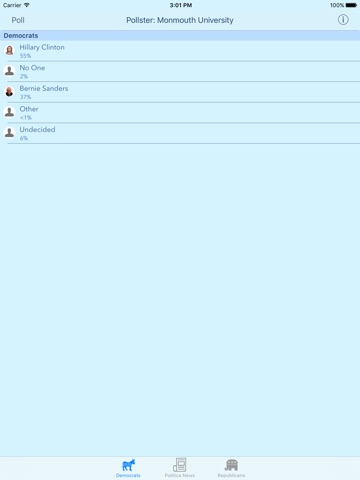 Prep yourself for the 2016 Presidential Election with Politica, your go-to app for all things leading up to the big election! Politica has all of the up-to-date polling information for all of the candidates from both sides. While checking the polling numbers you can read up on all of their details and view their trend graph to guess where theyll be next! If you dont believe a polls results, go ahead and change the poll, there are several polls available for each side! You cant forget about the news though. The "front page" of the app features a great collection of current news from a wide variety of political news sources.