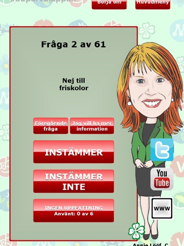 Nu är det snart val! Då är det bra med en app som är både underhållande och lärorik på samma gång, istället för trist och gravallvarlig (tyvärr symptomatiska drag för svensk politik överlag) som alla andra!