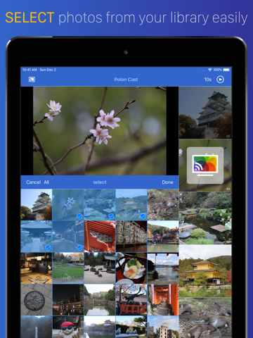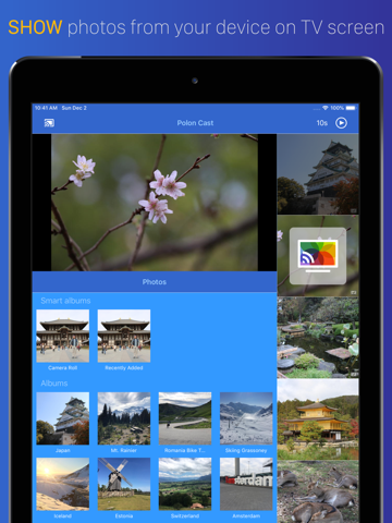 Show your family and friends photos and videos from vacation on a TV screen. Quickly create a slideshow from a photo album or use only selected photos. The app handles transition between photos so you can focus on the stories. With Polon Cast you can always pause, zoom, rewind skip and much more with an intuitive interface. Dont worry if you have hundreds of photos. With Polon Cast you can show up to 30 high resolution photos per minute.