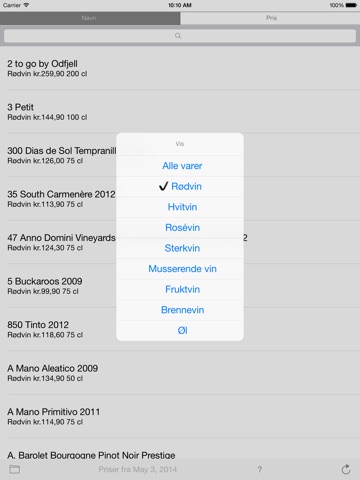 Du kan sortere på navn, pris, volum, alkoholinnhold, pris per liter eller pris per liter alkohol ved å trykke på de respektive fanene øverst i oversikten over drikkevarene. Det er også mulig å sortere på to felt, f.eks. for å finne ut hvilken vare som har høyest alkoholinnhold og deretter billigst