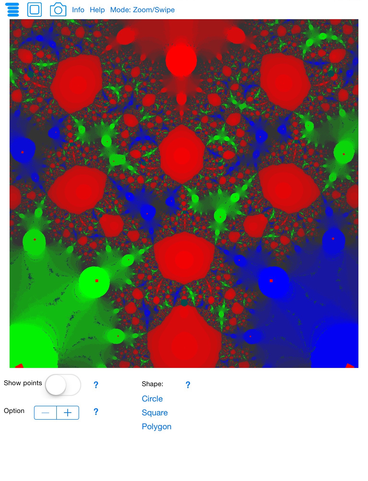 With this version of Poly-z-Vision you can build intricate artistic images fast. By only manipulating one point, for a total of three points of attraction, via mathematically-deep but transparent algorithms, the app allows you to render colorful images simply by dragging the point. The reaction to your artistic impulses can be seen immediately, allowing creation of intriguing unique images in real time. You can easily adjust colors and other features in your images, make them spiral, zoom, recolor etc.