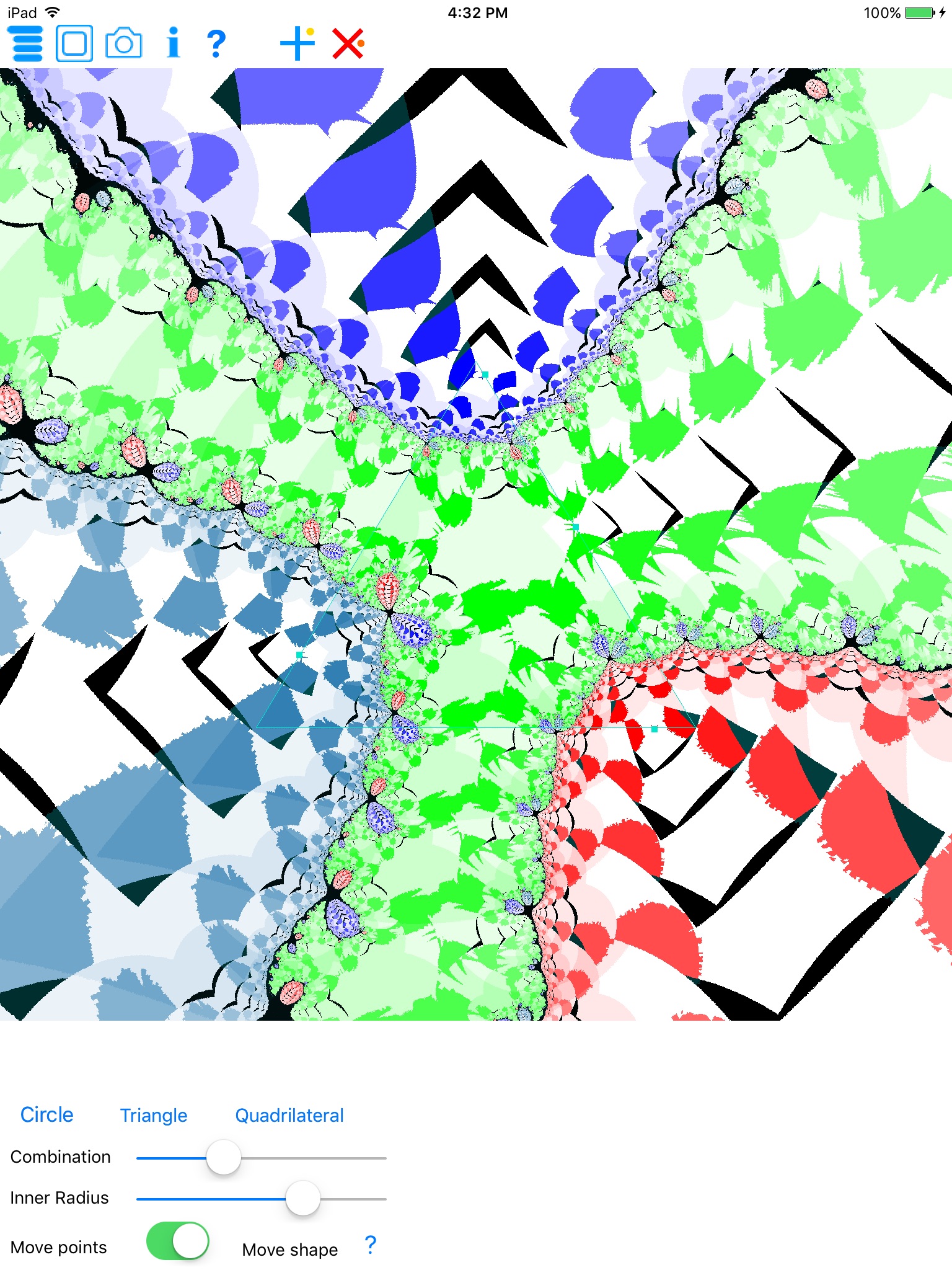 The app allows you to create abstract art-like images. You choose between a triangle, a circle and a rectangle as the basic shape, but the resulting image often looks much more sophisticated than the basic shape. Internally, the app uses fractal trap algorithm to count number of iterations falling within the basic shape. However, you dont need to know any mathematical details to produce intriguing images.