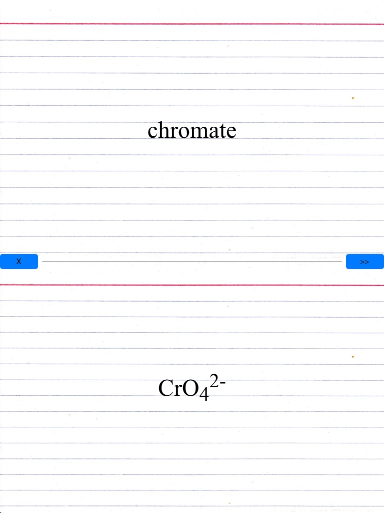 Flash Cards with the common polyatomic ions. Helps commit the polyatomic ions to memory, including their molecular formulas and ionic charge. Study by name or formula or both. Go at your own speed or set the timer.