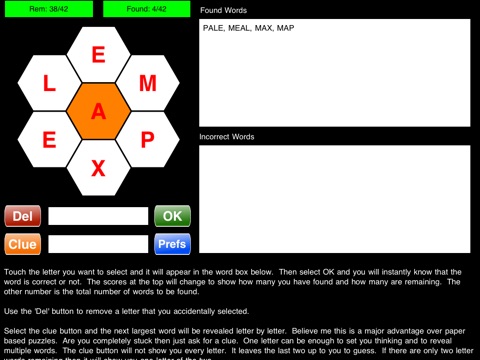 A randomised word is shown with a letter in the center. Touch the letter you want to select and it will appear in the word box below. Then select OK and you will instantly know that the word is correct or not. The scores at the top will change to show how many you have found and how many are remaining. The other number is the total number of words to be found.