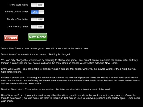 Select the Prefs button to see the preferences for the App and also select to start a new Game. You can only change the preferences by selecting to start a new game. You cannot decide to enforce the central letter half way through a game nor can you decide to disable the show alerts so choose wisely before selecting New Game.