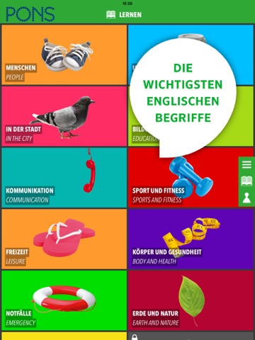 Mit dem PONS Bildwörterbuch Englisch können Sie über 15.000 Wörter, Übersetzungen, Audio-Dateien und Fotos ansehen, anhören und lernen. So merken Sie sich Vokabeln schneller und einfacher.