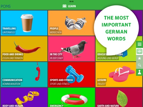 With the PONS Picture Dictionary German you can look at, listen to and learn over 15,000 words, translations, images and audio files. It’s the best combination to learn and remember vocabulary.