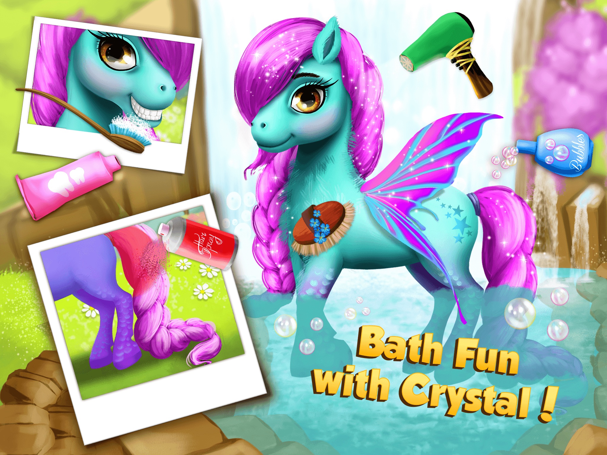 · Have tons of bath fun with Crystal - clean up her fur, brush teeth, play with bubbles and flowers in waterfall spa, brush hair and color her long tail like a rainbow!