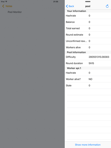 Pool Monitor displays information about hashrate, alive workers and amount of currency on your account.