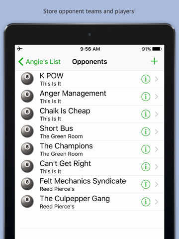 Pool Team Manager is a great tool for team captains, as well as players. Keep all of your session information at your fingertips. Record and store all of your teams plus your opponents teams, including player names & handicaps. Never risk going over! Use the easy lineup calculator to keep your team match-ups under the handicap limit. Always know when and where you play! Keep track of your session schedule, including the opposing team name, date, and location of the match.