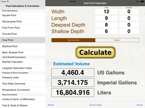 The Pool Volume and Size app is a great set of specialized calculators to estimate the volume of water in any shape pool whether it be in US Gallons, Imperial Gallons or Liters.