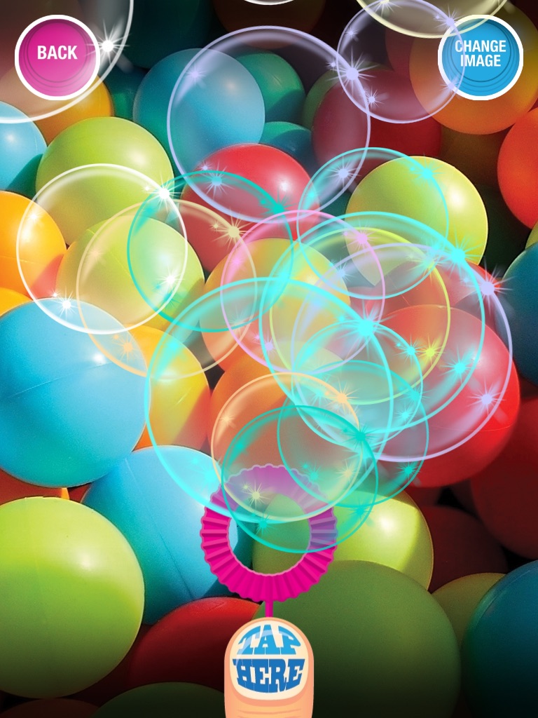 Tap n’ Pop Mode gives you the ability to tap the blower and blow as many bubbles as fast you’d like while the little ones pop them before they gently float off the screen. Change the background to reflect your mood. Go for the bright and cheerful ball pit or for the calm and relaxing river side walkway.