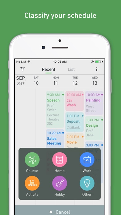 We provide several types almost cover your daily life to classify your events: course, family, work, activity, hobby and others. And you can distinguish these events with different colors.