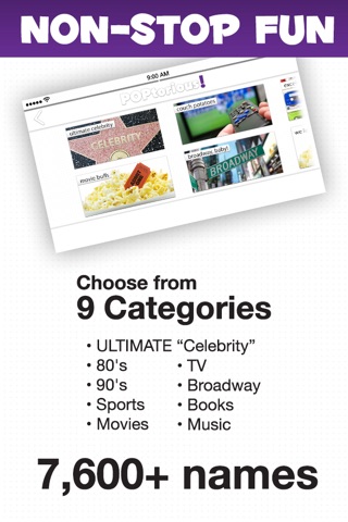 POPtorious! – Party Edition is the ultimate celebrity, character and pop culture guessing game! You and your friends hilariously act out, impersonate, describe and try to guess as many famous names, things or phrases as you can before the timer runs out!