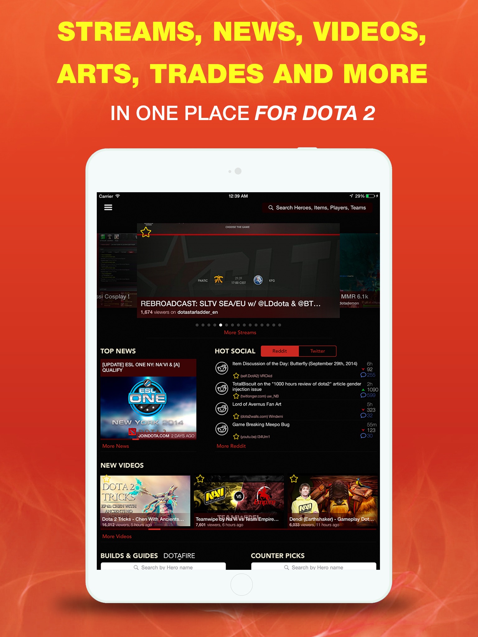 Browse your favourite players streams, read the most recent and relevant news, find the best video, watch the the most beautiful pictures, and all this in one place based on the Dota 2 game!
