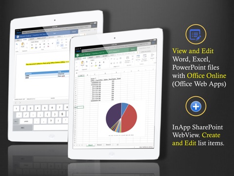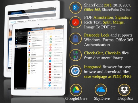 · App helps you access wide range of Documents hosted on your sites including the MS Office Documents (Word, Excel, Outlook, PowerPoint) PDFs, Images Emails, Task Lists, Calendars and etc.,