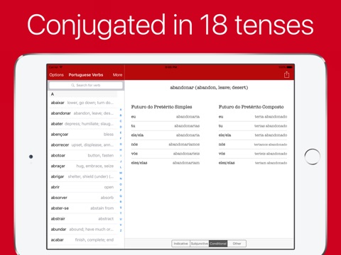 View over 700 Portuguese verbs in 18 tenses. With simple navigation and built in search, you can find the verb you need in seconds.