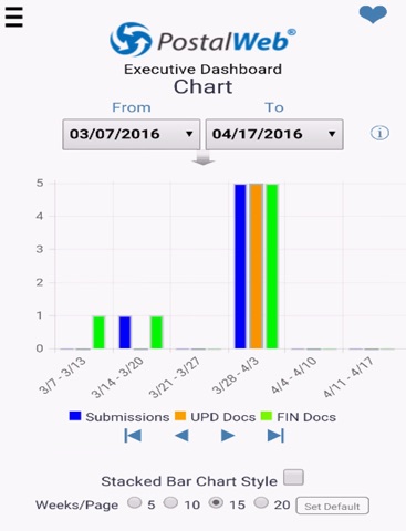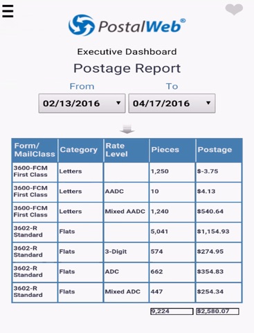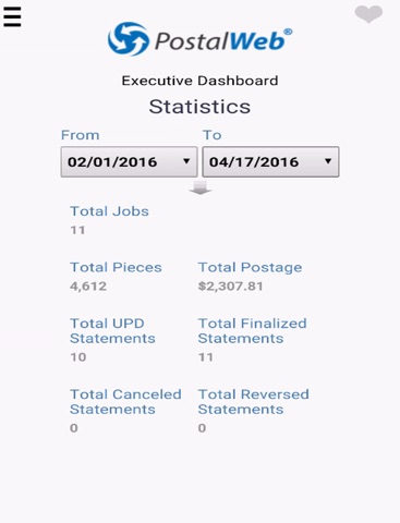 The PostalWeb® Dashboard mobile app helps managers of commercial mailing departments view the status of mail.dat files submitted to PostalOne!® . It also provides statistics on these submissions as well as postage summaries for date ranges requested by the user. This is a must have for busy managers who rarely have the time or the opportunity to view this information on a desktop computer.