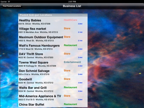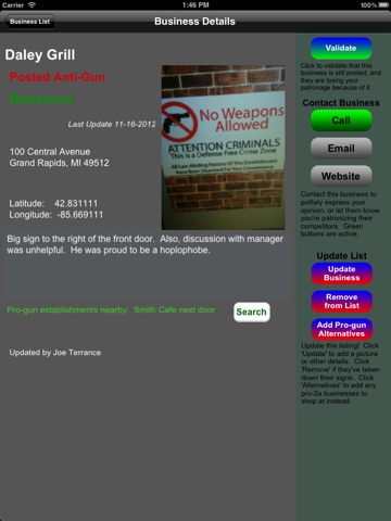 I just purchased this app and am optimistic about it! So happy find an app that lists businesses that do not consider the safety of their patrons to be important. I choose to avoid those businesses because a) they invite gun-toting criminals; b) I carry my gun everywhere. Leaving it in a locked vehicle is not an option (as far as I am concerned.) [UPDATE] This is a great app! The location we went go a concert tonight is on the list so I knew to not take my firearm tonight.