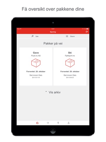 The Posten app makes it easy to track, order home delivery and pick up your packages. You can also send packages in the app, and pick up packages in pakkeboks.