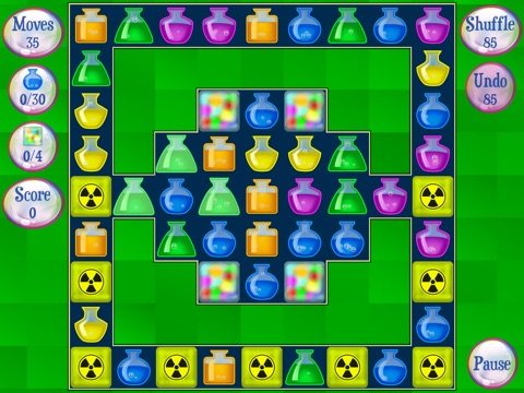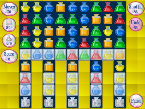 Swap potions to create matches in this exciting and challenging match-3 game! Make combinations of 3 to destroy potions. Create explosive bomb potions by making combinations of 4. "T" and "L" shaped combination will create zap potions. Combinations of 5 will create the super potion. Different goals throughout the game keep levels feeling fresh and exciting. Some levels require collecting potions of a certain color while in others you need to destroy frozen potions. Each set of 10 levels includes a more challenging bonus level which must be unlocked.