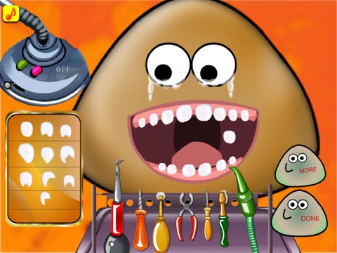 After eating a lot of candies pou destroyed his teeth. he has cavities all over and pieces of food stucked between his teeth. use the tools we provided you with and try to clean pous mouth