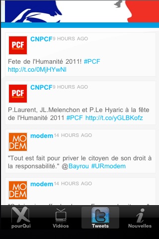 * daccéder aux "tweets" de certains partis et mouvements politiques pour lesquels un compte twitter a été trouvé (ceux qui ny figurent pas sont invités à lenvoyer pour le faire ajouter);
