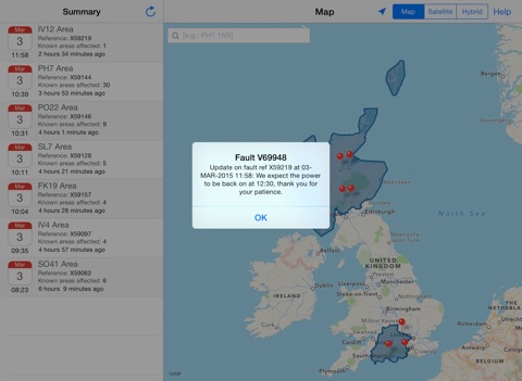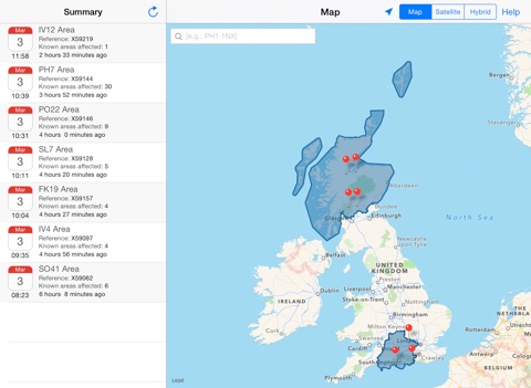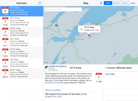 IMPORTANT: This application will only display power cuts in the areas managed by Scottish and Southern Electricity Networks. Please see the screen shots for a map of the areas covered. If you are outside these areas, please contact your energy distributor regarding any power cuts.